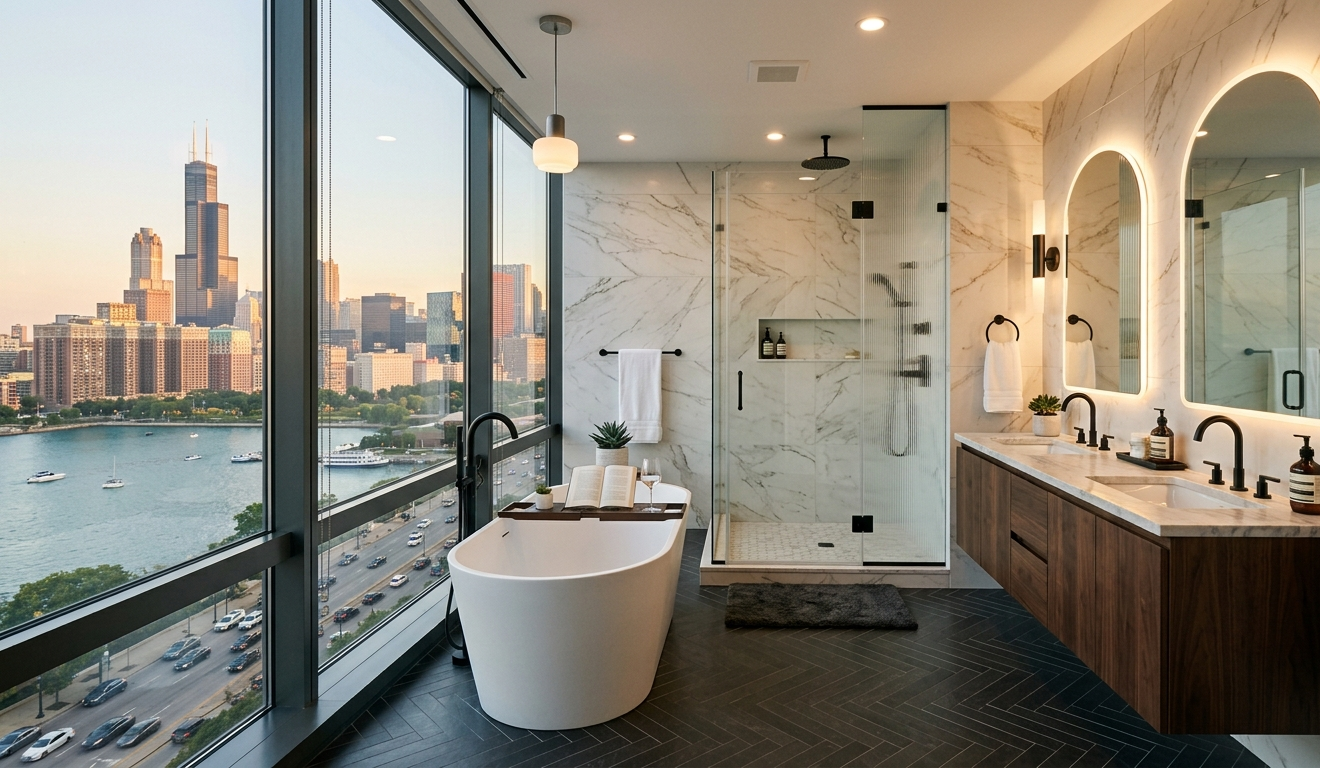 Premium concept for Chicago winters: Imagine a master bath with custom herringbone tile and radiant heated floors. This design is perfect for condos where luxury must meet strict building logistics and work-hour rules.